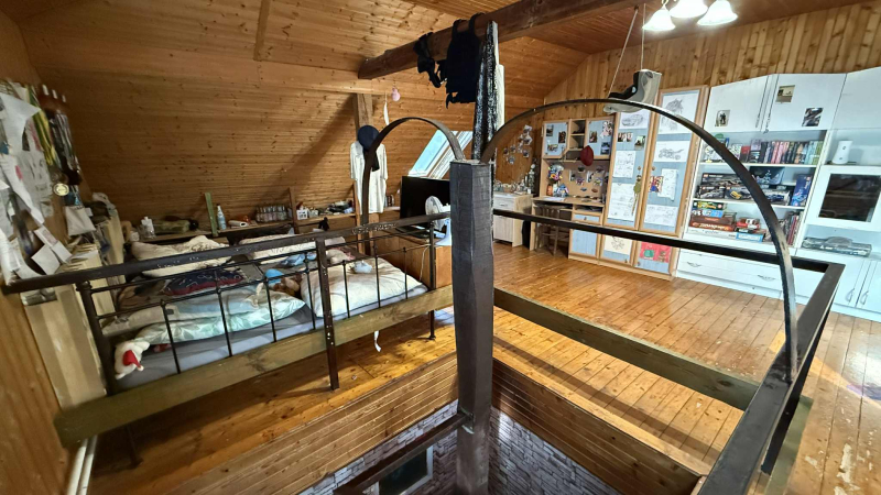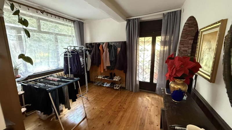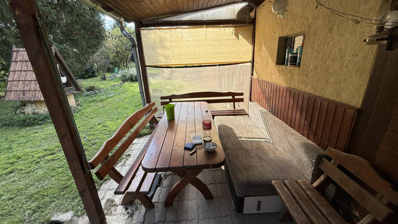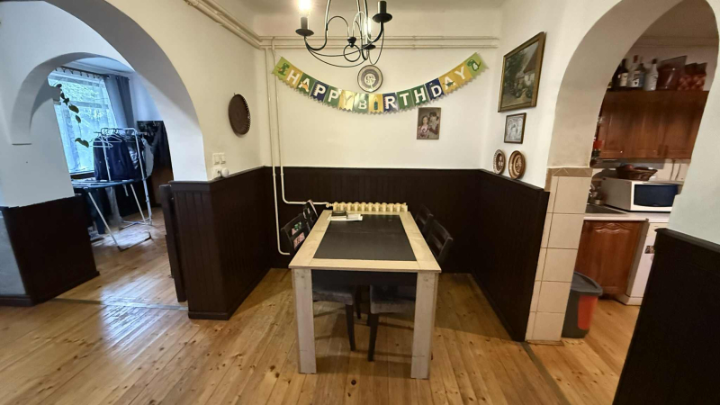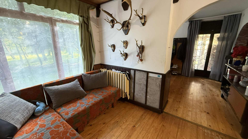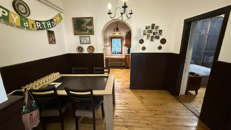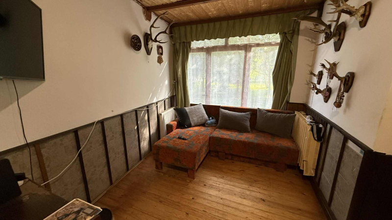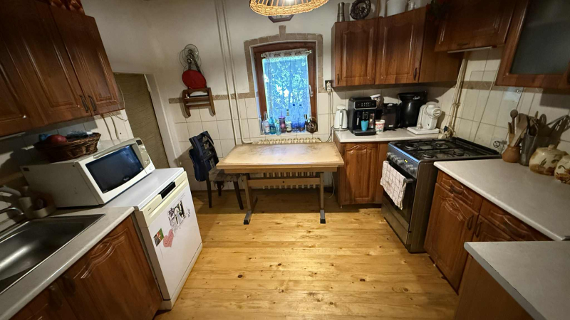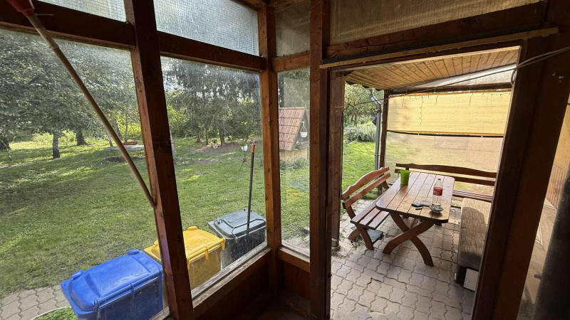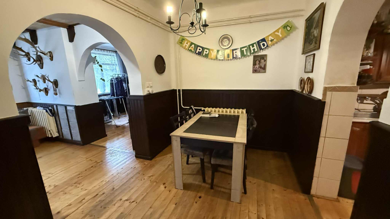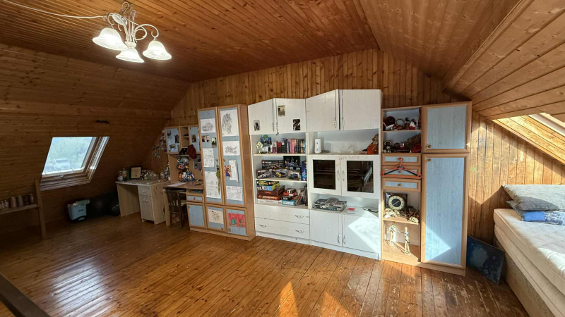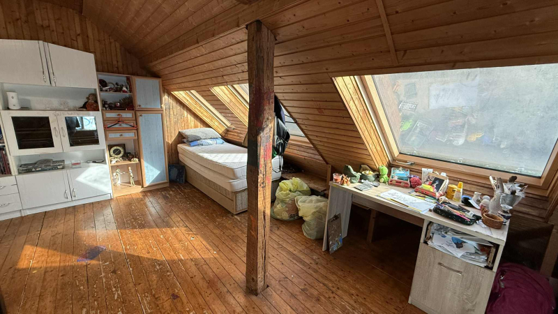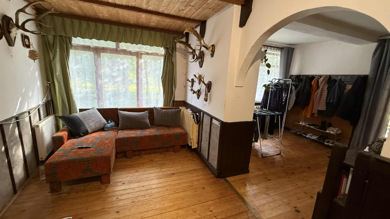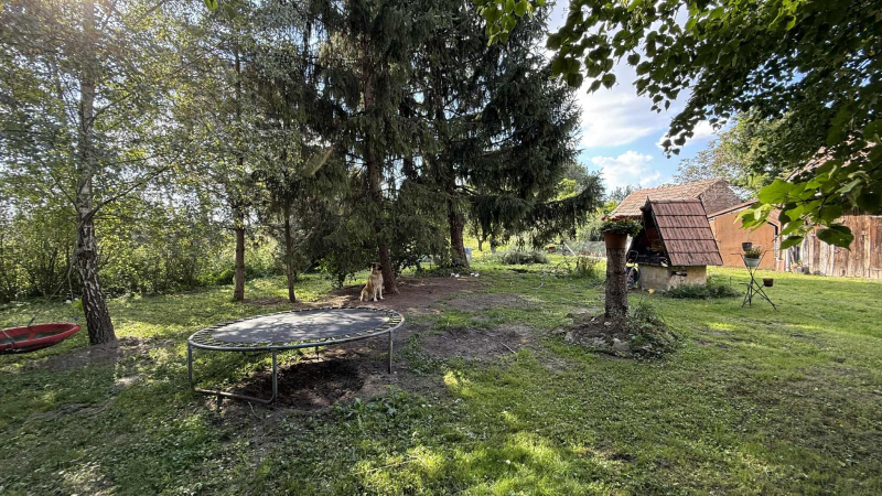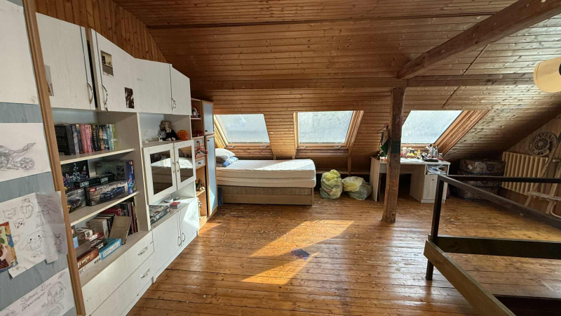 Die Immobilie befindet sich in gutem Zustand, braucht aber etwas Verschönerung. Zwei große, geräumige Zimmer, ein helles Wohnzimmer mit Blick auf den Garten, ein Vorraum – letzteres kann durch Entfernen einer Wand verbunden werden! Es gibt ein Esszimmer, eine Küche mit Speisekammer sowie ein Badezimmer. Im Obergeschoss befindet sich ein 30 m² großes Dachzimmer, früher als Atelier genutzt, aber ideal für Kinder oder auch als Büro geeignet.Zentralheizung mit einem Kombikessel, dreiphasiger Stromanschluss, Holzfenster und stimmungsvolles Dielenparkett im gesamten Haus.