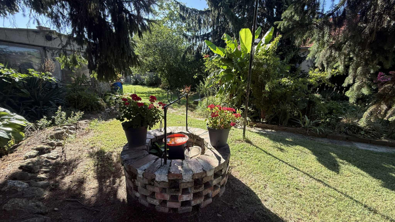Der Garten ist gepflegt, eingezäunt, mit vielen Blumen, Obstbäumen und einem Gartenbrunnen, zusätzlich gibt es ein Nebengebäude, eine Garage, eine Werkstatt und einen Stall.