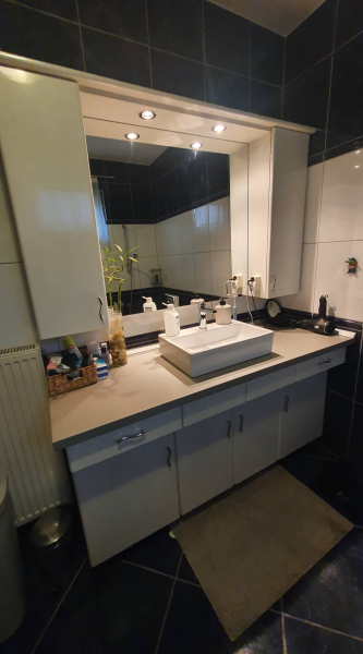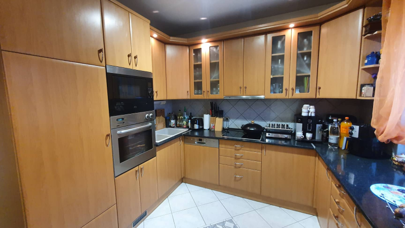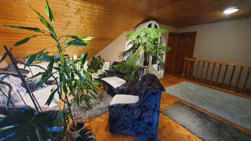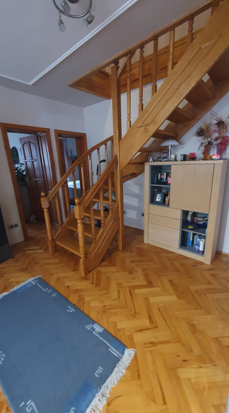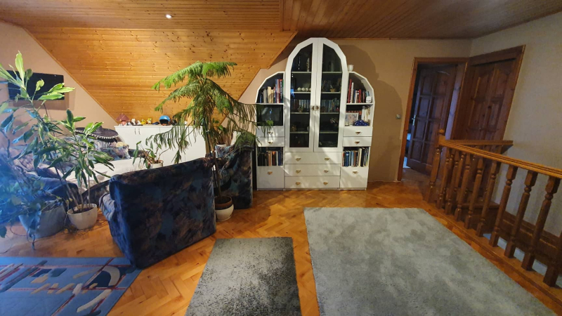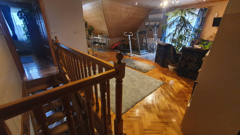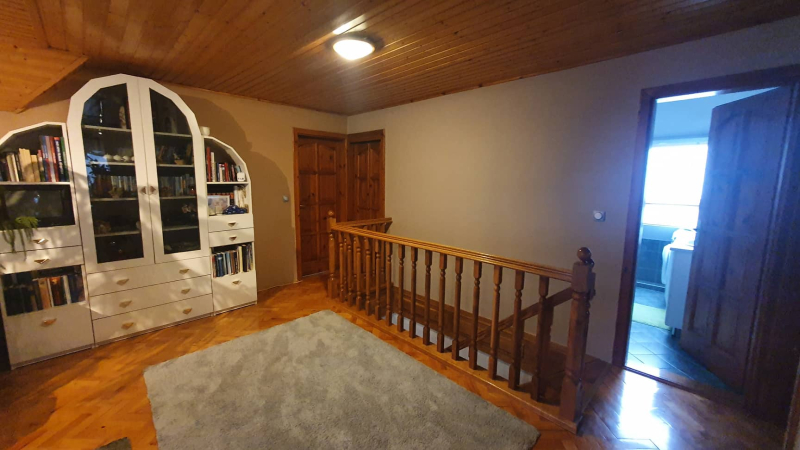 A felső szinten további két hálószoba található, az egyik erkéllyel, egy hatalmas nappali, szintén erkéllyel, egy konyha és étkező, egy gardrób és egy fürdőszoba.