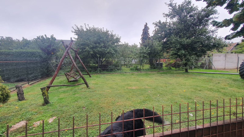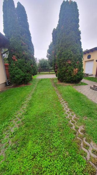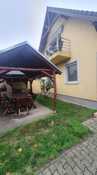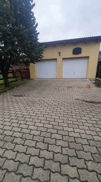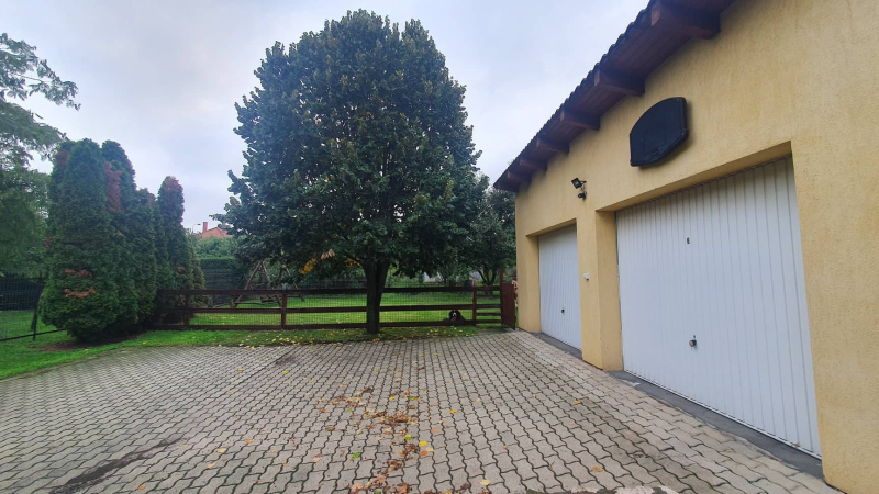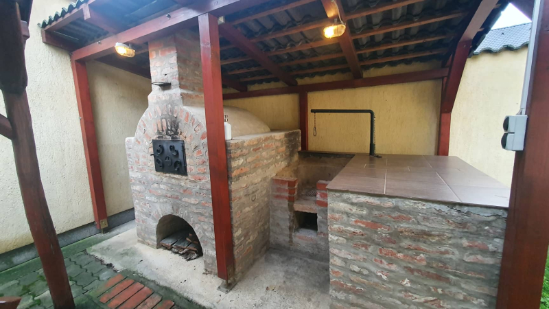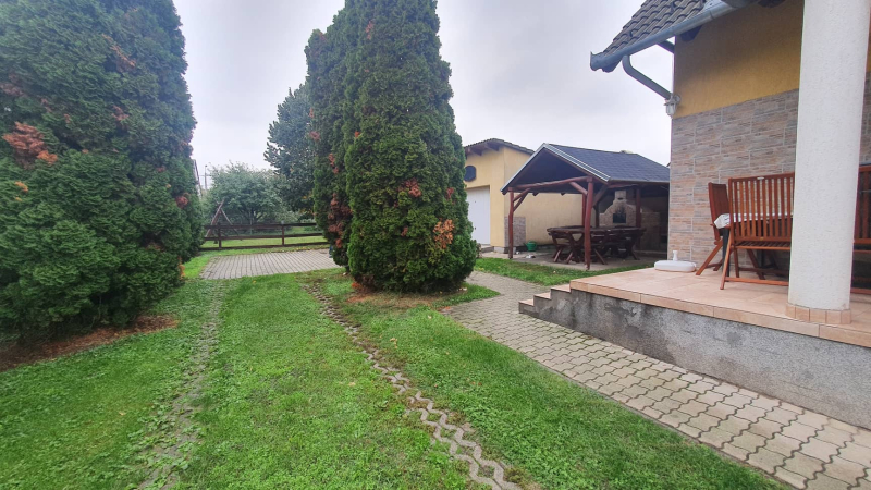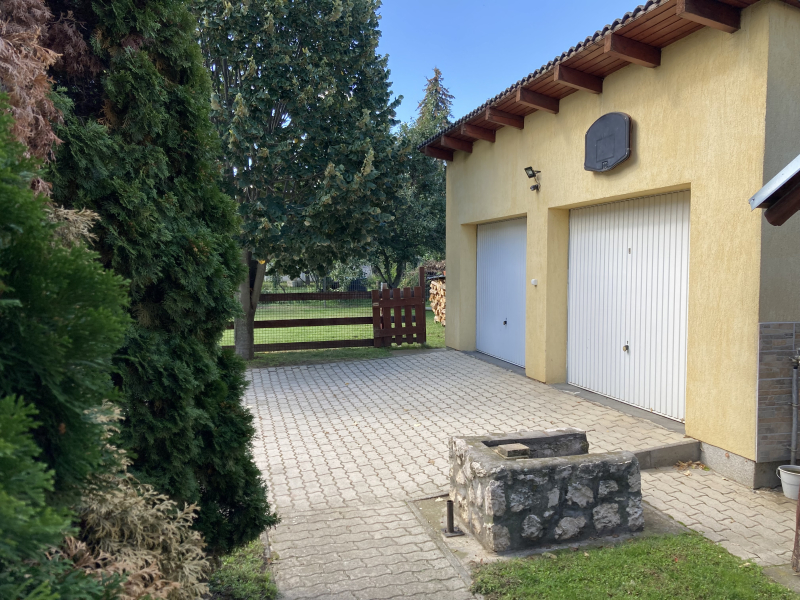 A kertben van egy fedett kerthelyiség beépített kemencével, kerti grillező, a udvar gondozott, zöldellő, dupla garázzsal!