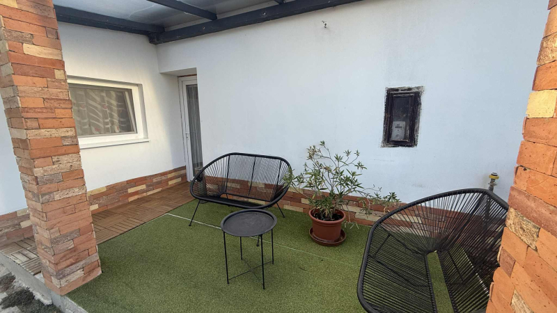 Räume: In der ersten Wohnung, die 70 m² groß ist, befinden sich zwei Schlafzimmer, eine ausgestattete amerikanische Küche mit Esszimmer und Wohnzimmer, ein Badezimmer mit Dusche und ein Heizungsraum mit Gäste-WC. Dazu gehört eine 15 m² große Terrasse.