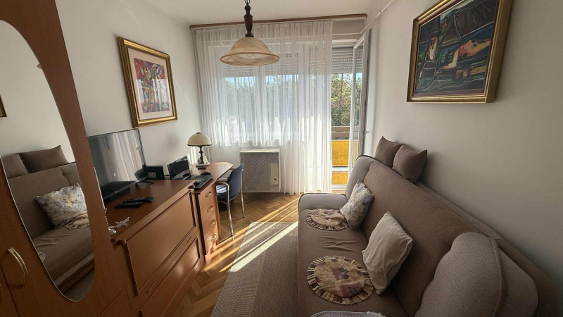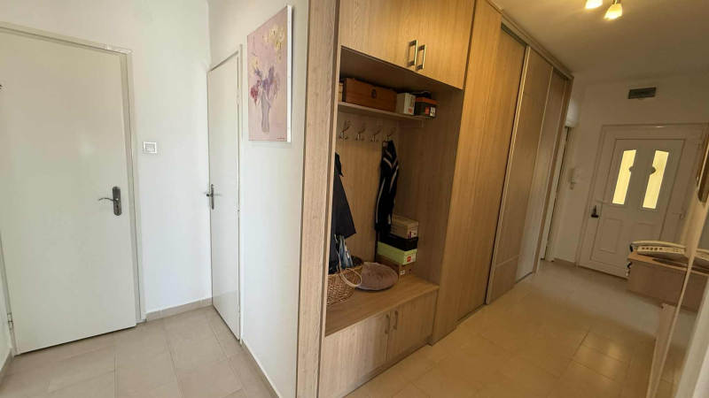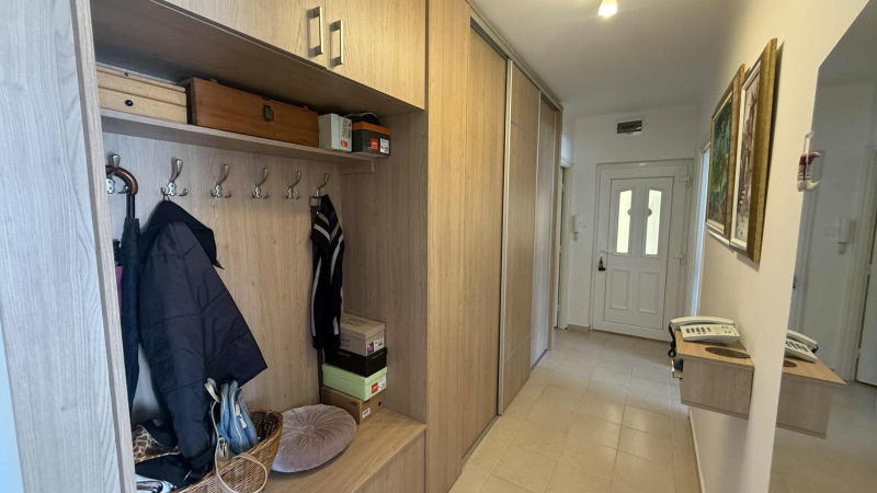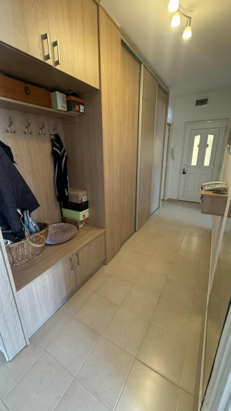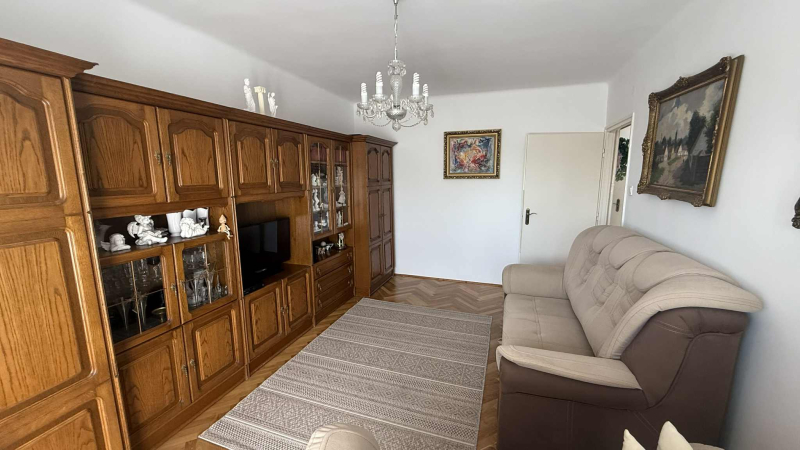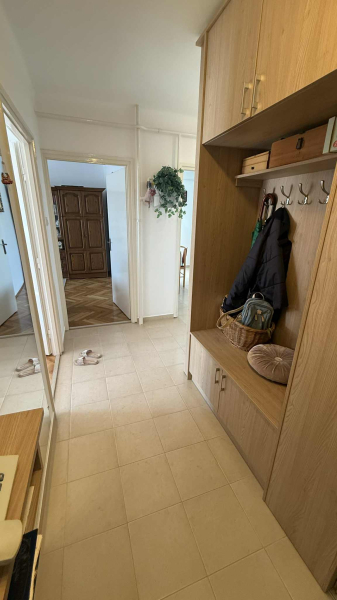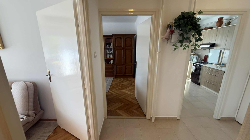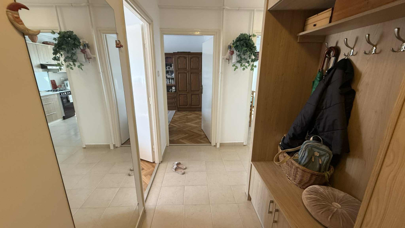 Három tágas,világos szoba,mindegyikből ki lehet menni az erkélyre,folyosó hatalmas beépített szekrénnyel,fürdőszoba,gépesített konyha és étkező,valamint spájz és wc található.